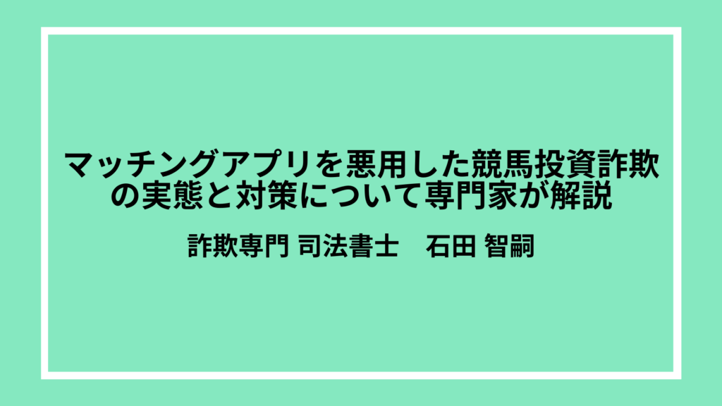 より具体的には「【2024年最新版】これって競馬投資詐欺?マッチングアプリの競馬投資ソフト契約は詐欺の可能性あり「手口と返金事例」を徹底解説」を併せてご覧ください。