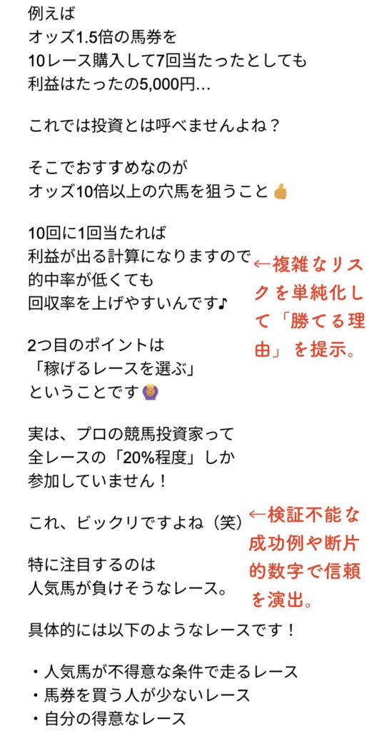 このマニュアルは、複雑なリスクを単純化して「勝てる理由」を提示し、検証不能な成功例や断片的数字で信頼を演出している点悪質が高いと思われます。
