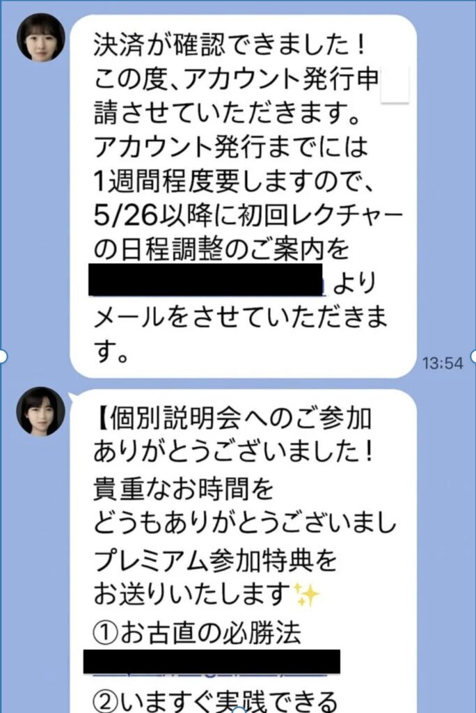 「アカウント発行には約1週間ほどかかります」と説明されていますが、これはクーリングオフ期間(8日間)を過ぎるのを待つ意図があるのではないかと考えられます。通常、オンライン上のアカウント発行に1週間も要することはまれであり、契約の撤回や返金請求を難しくするための時間稼ぎと見られても不自然ではありません。