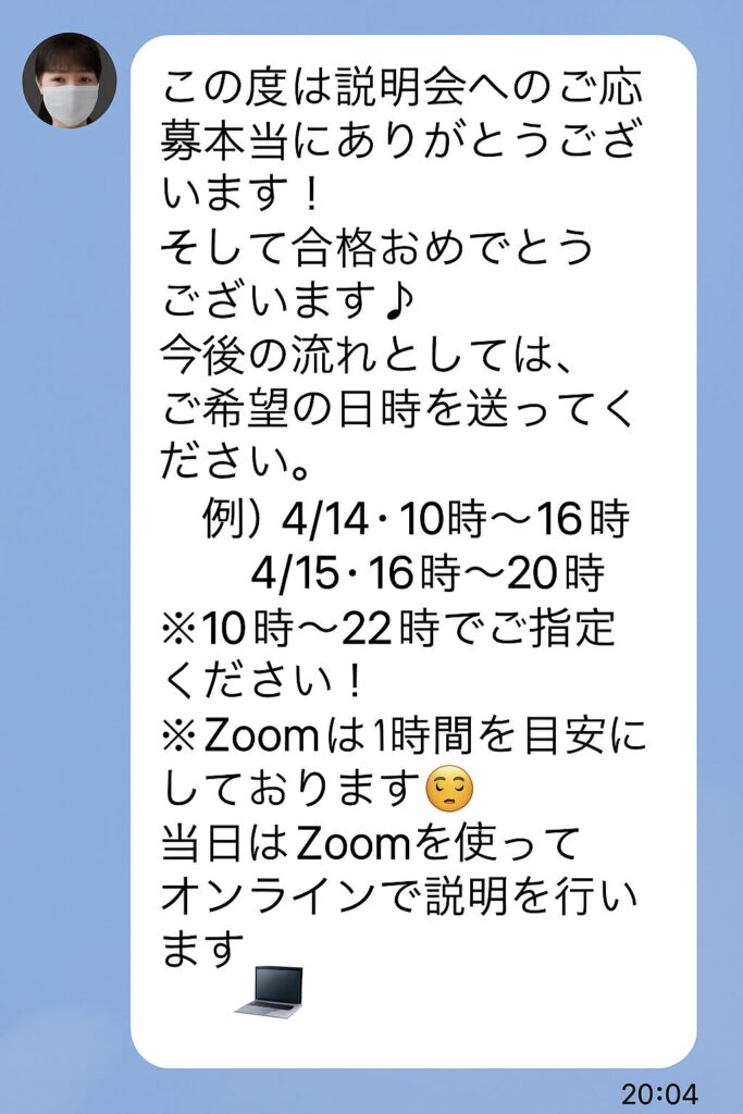 興味を持って個別説明会に申し込むと、すぐにLINEで丁寧なメッセージが届き、Zoomでの説明会が案内されました。